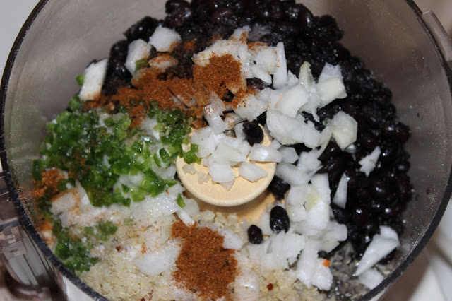 Combine the quinoa, black beans, onion, garlic (optional), oil, pepper, and seasonings in the bowl of the same food processor. Mix only to blend, leaving some visible chunks.