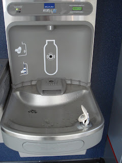 After a quiet solitary stroll for fresh fruit I see “signs” of hope. First the drinking fountain below, recording the number of bottles saved through reuse and refilling. Then a poster promoting smart meters – also shown below. These meters encourage the use of appliances off peak hours, to save the environment and money. A few steps later I stumble upon a reycling bin, right there, in an airport!