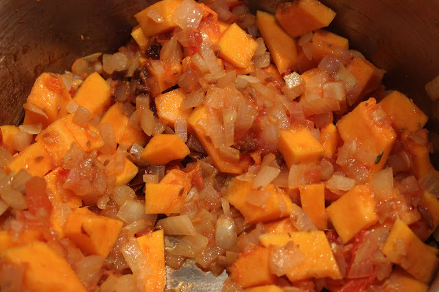 Melt the oil or ghee in a saucepan, add the diced onion and cook for 7 minutes. Add the chopped jalapeno or cayenne, and the cumin. Stir to incorporate and cook another minute. Add the chopped sundried tomatoes and the diced squash. Mix to cover the vegetables with the spices.