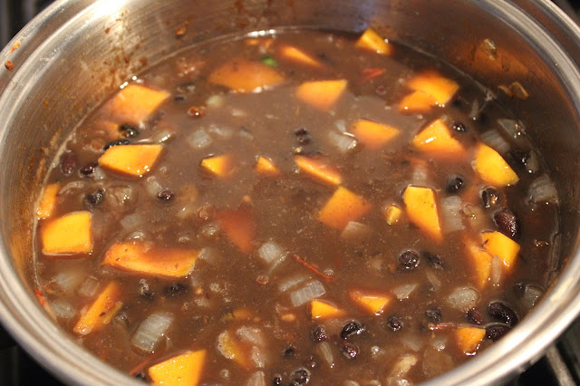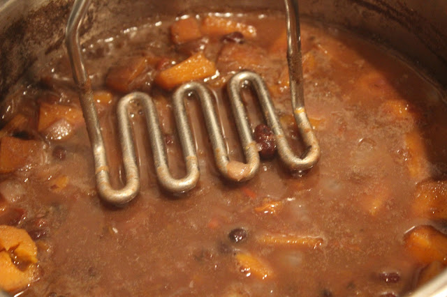 Let the soup cook for 30 minutes. Turn off the heat, and take a potato masher and gently mash the beans and the squash. Mash this to your own preference, whether you like it chunkier or more homogenized. Adjust the liquid, adding more if necessary.