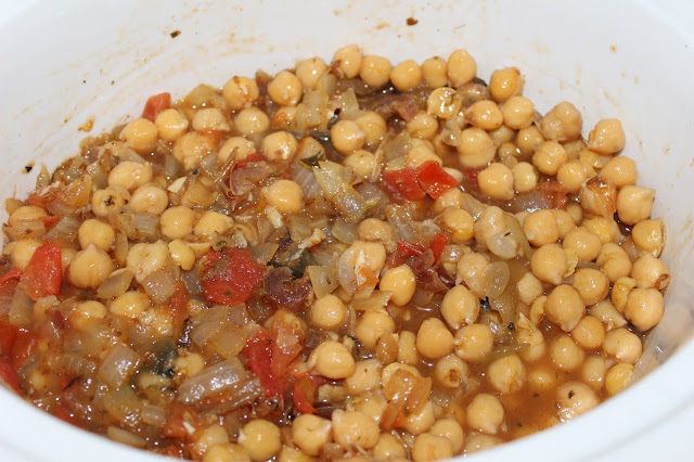 Everything in the slow cooker. I added more cooking liquid from the beans to this pot. Lightly cover the chickpeas.