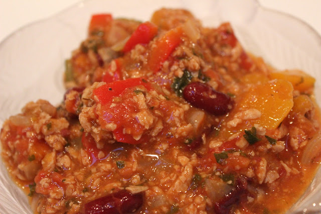Stir the chili, check the flavoring and adjust if necessary. Serve with a grain (we ate couscous) and the green vegetable.